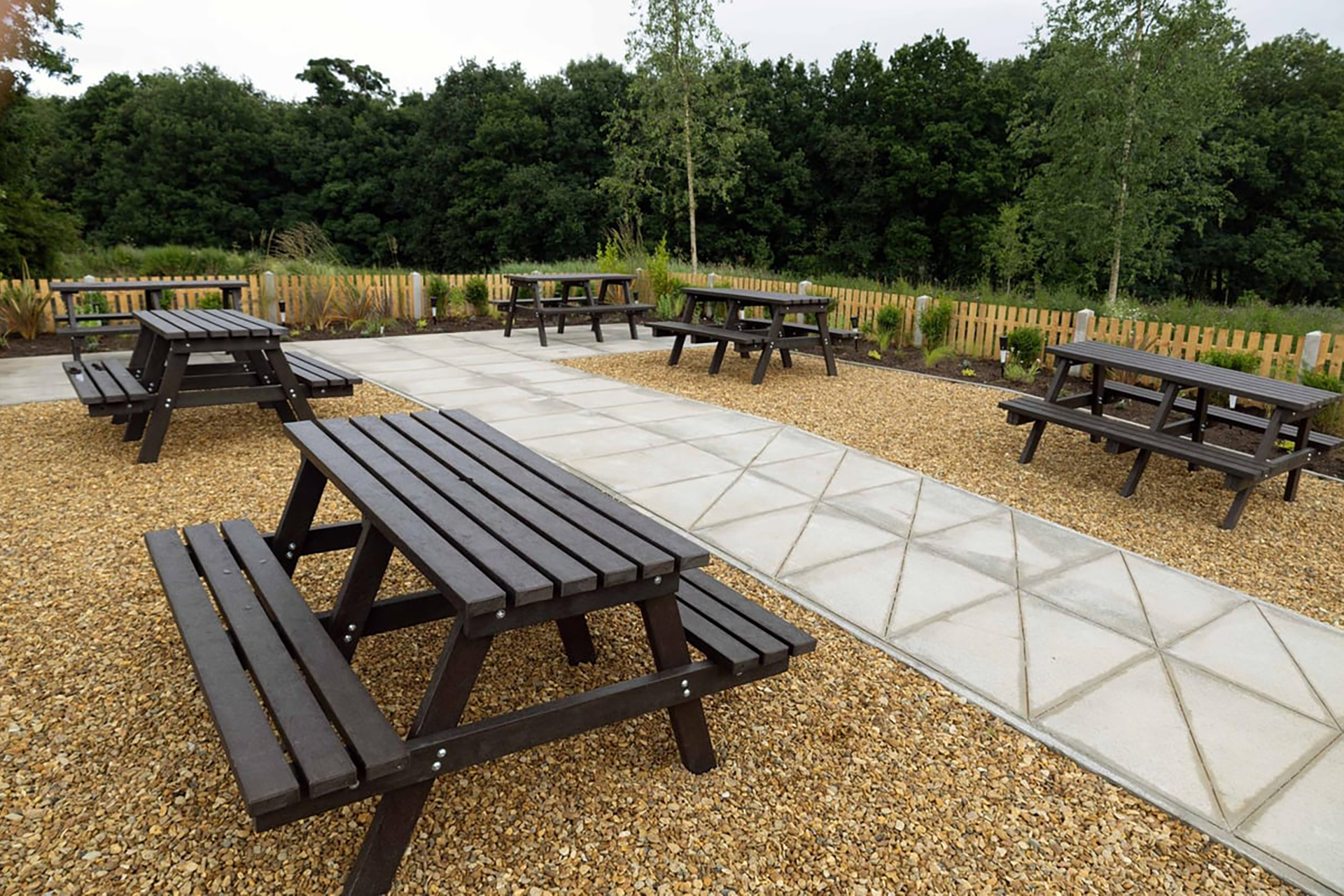 As part of their committment to social value, MTX also funded a new outdoor garden area for staff to enjoy. The new space includes picnic tables and benches surrounded by plants, with views of the countryside around the hospital.